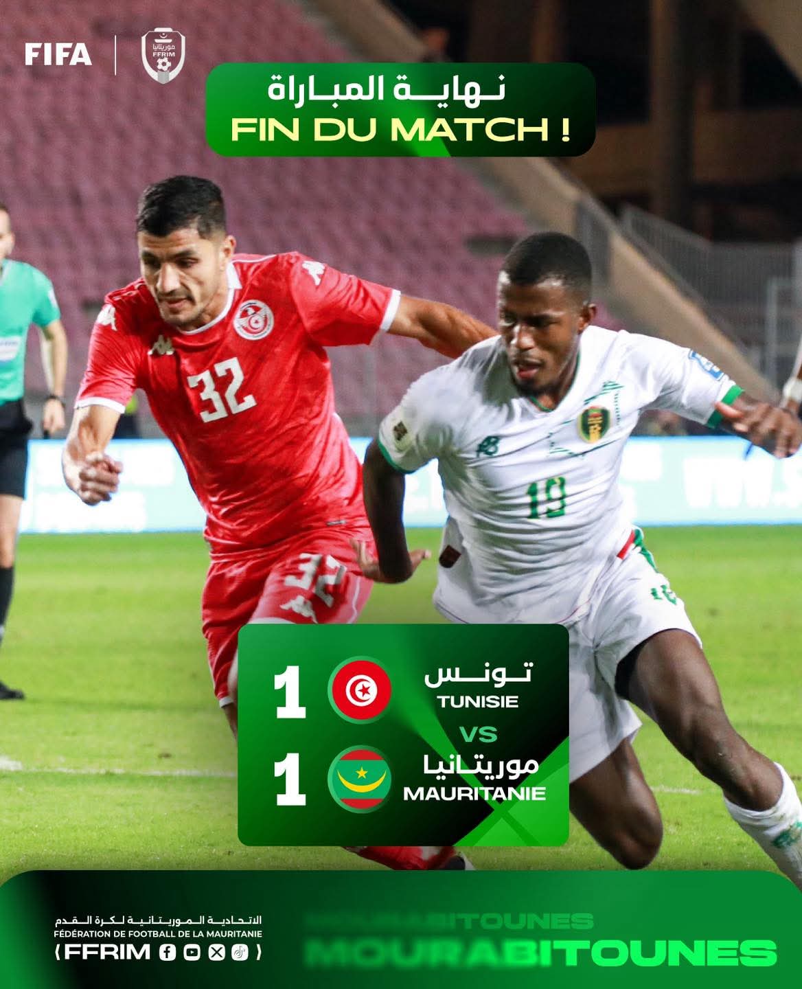 تعادل المنتخب الوطني الموريتاني المرابطون مساء اليوم مع نظيره المنتخب التونسي بنتيجة (1-1) في مباراة ودية أقيمت على ملعب رادس بالعاصمة التونسية.