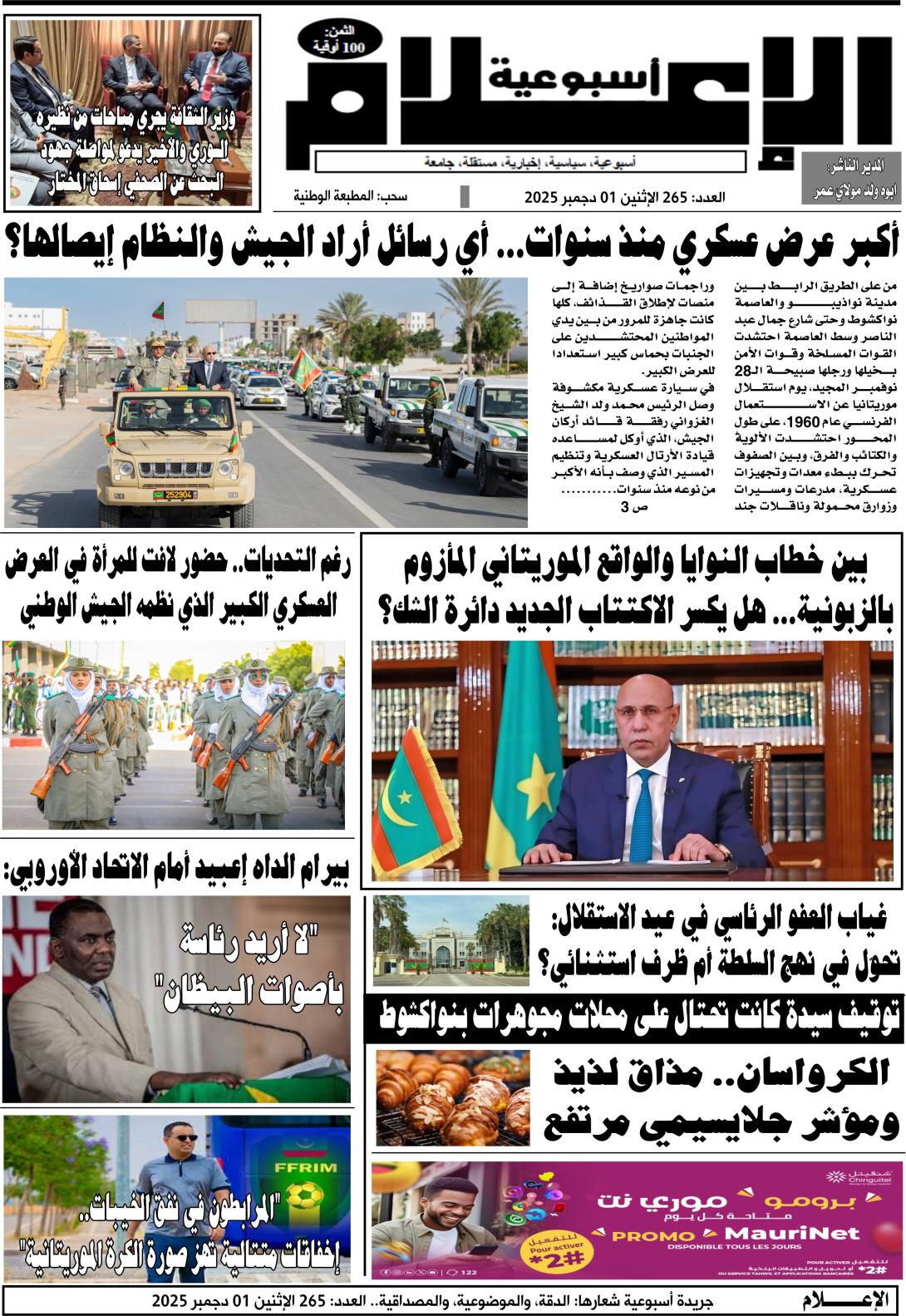 من على الطريق الرابط بين مدينة نواذيبو والعاصمة نواكشوط وحتى شارع جمال عبد الناصر وسط العاصمة احتشدت القوات المسلخة وقوات الأمن بخيلها ورجلها صبيحة الـ28 نوفمبر المجيد، يوم استقلال موريتانيا عن الاستعمال الفرنسي عام 1960، على طول المحور احتشدت الألويةُ والكتائب والفرق، وبين الصفوف تحرك ببطء معدات وتجهيزات عسكرية، مدرعات ومسيرات وزوارق محمولة وناقلات جند وراجمات صواريخ إضافة إلى منصات لإطلاق القذائف، كلها كانت جاهزة للمرور من بين يدي المواطنين المحتشدين على الجنبات بحماس كبير استعدادا للعرض الكبير.