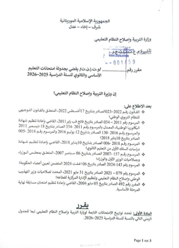 أعلنت وزارة التربية وإصلاح النظام التعليمي عن الأجندة الرسمية للامتحانات الوطنية للعام الدراسي 2025 – 2026، وذلك بموجب مقرر موقع من طرف الوزيرة هدى بنت باباه، حيث تم اعتماد الفترة الممتدة من 22 يونيو إلى 2 يوليو 2026 لإجراء مختلف الامتحانات.