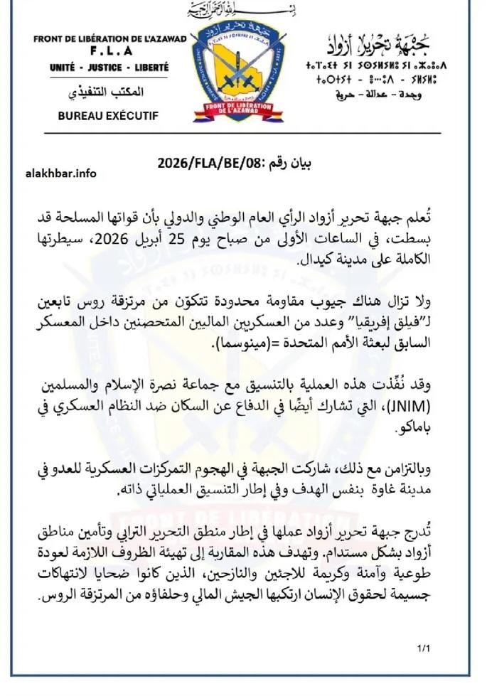 أكدت جبهة تحرير أزواد في بيان نشرته في وقت متأخر من مساء السبت سيطرتها بشكل كامل على مدينة كيدال