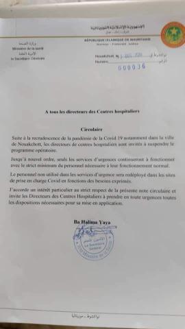 الإعلام نت - علقت وزارة الصحة الموريتانية -في تعميم أصدرته اليوم السبت- برمجة العمليات الجراحية في جميع المستشفيات الوطنية ويأتي التعليق انسجاما مع الاجراءات الإحترازية للحد من تفشي الموجة الثانية من فيروس كورونا.