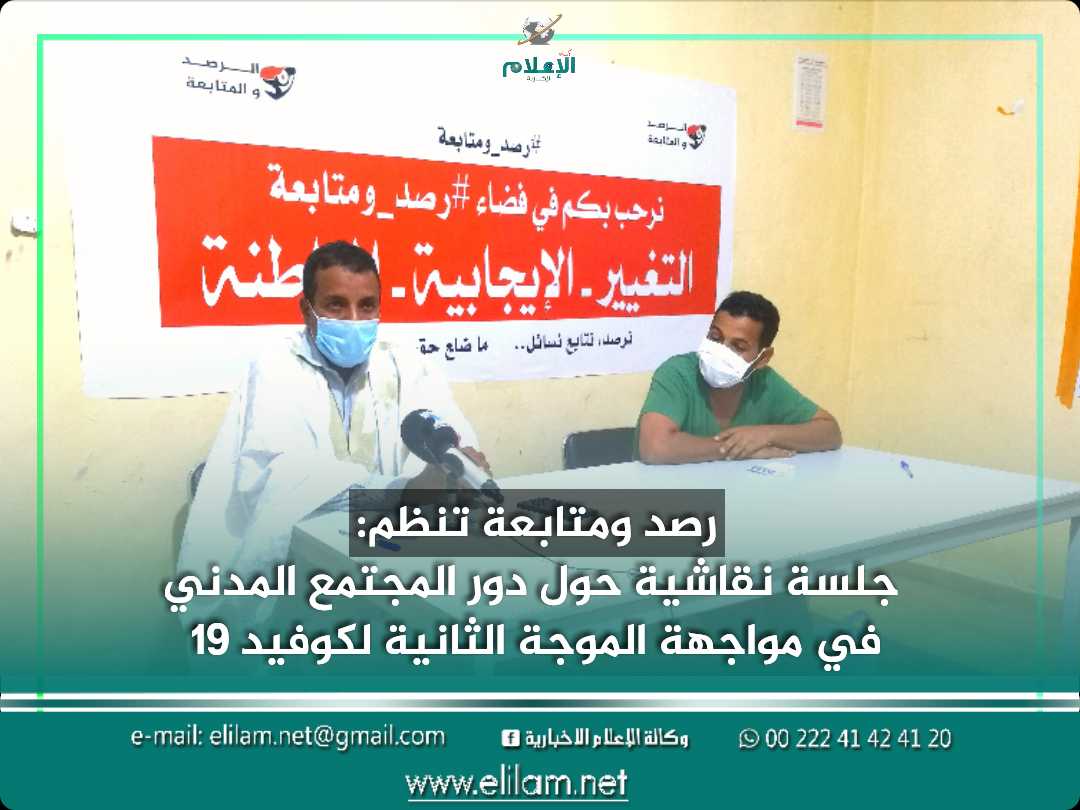 الإعلام نت - نظمت مبادرة رصد ومتابعة مساء اليوم السبت 12 دجمبر 2020 بمقرها بانواكشوط جلسة نقاشية حول دور المجتمع المدني في التوعية ضد وباء كوفيد 19 في ظل الموجة الثانية من الوباؤ التي تجتاح البلاد منذ أزيد من أسبوع.