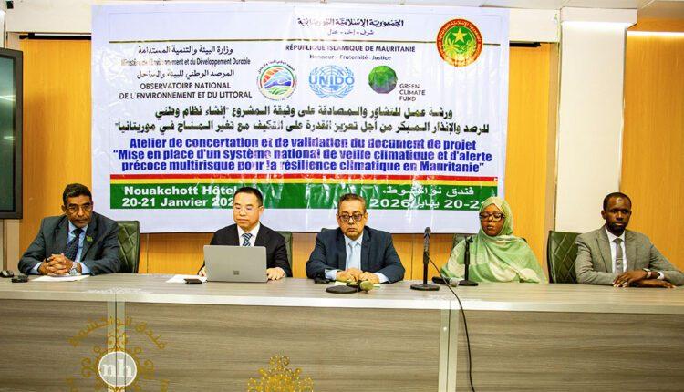 أطلقت وزارة البيئة والتنمية المستدامة، اليوم ورشة تشاورية للمصادقة على وثيقة مشروع “إنشاء نظام وطني للرصد والإنذار المبكر من أجل تعزيز القدرة على التكيف مع التغيرات المناخية في موريتانيا”.