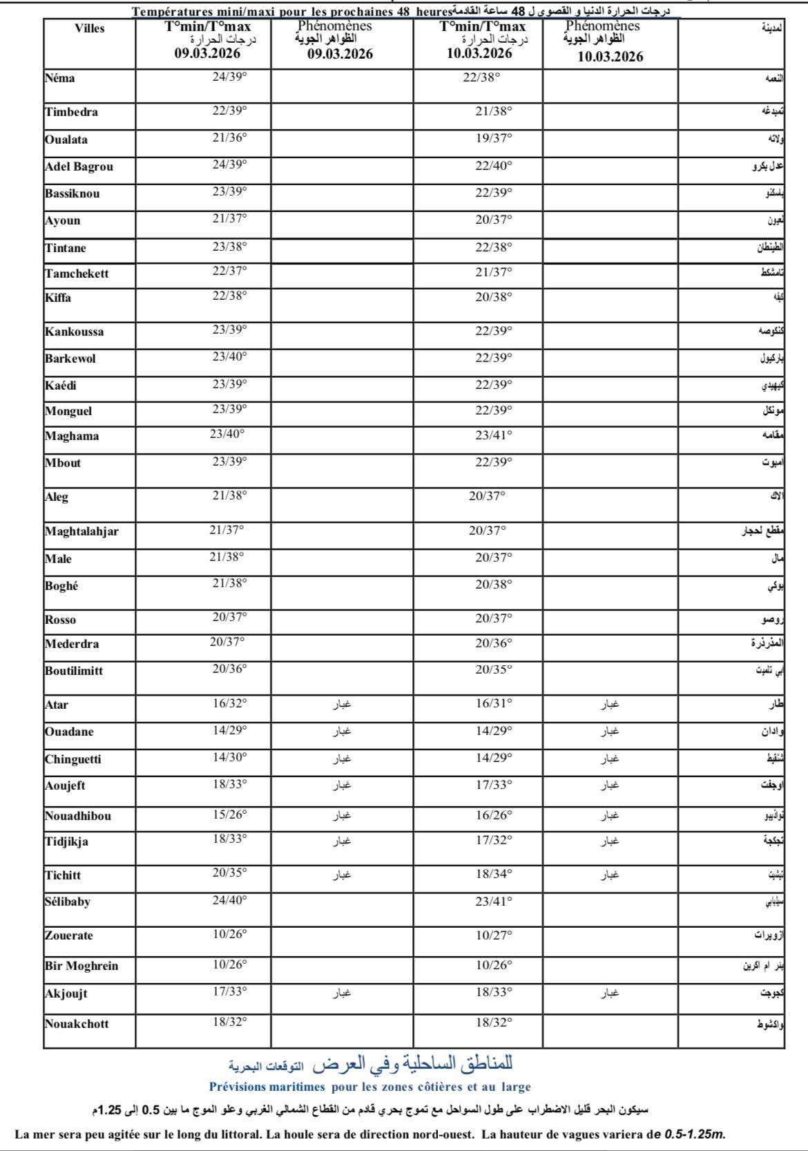 وقالت إن نواكشوط ستعرف رياحا ضعيفة إلى معتدلة شمالية إلى شمالية شرقية مع درجات الحرارة مرتفعة وسماء قليلةِ الغيوم إلى غائمة.
