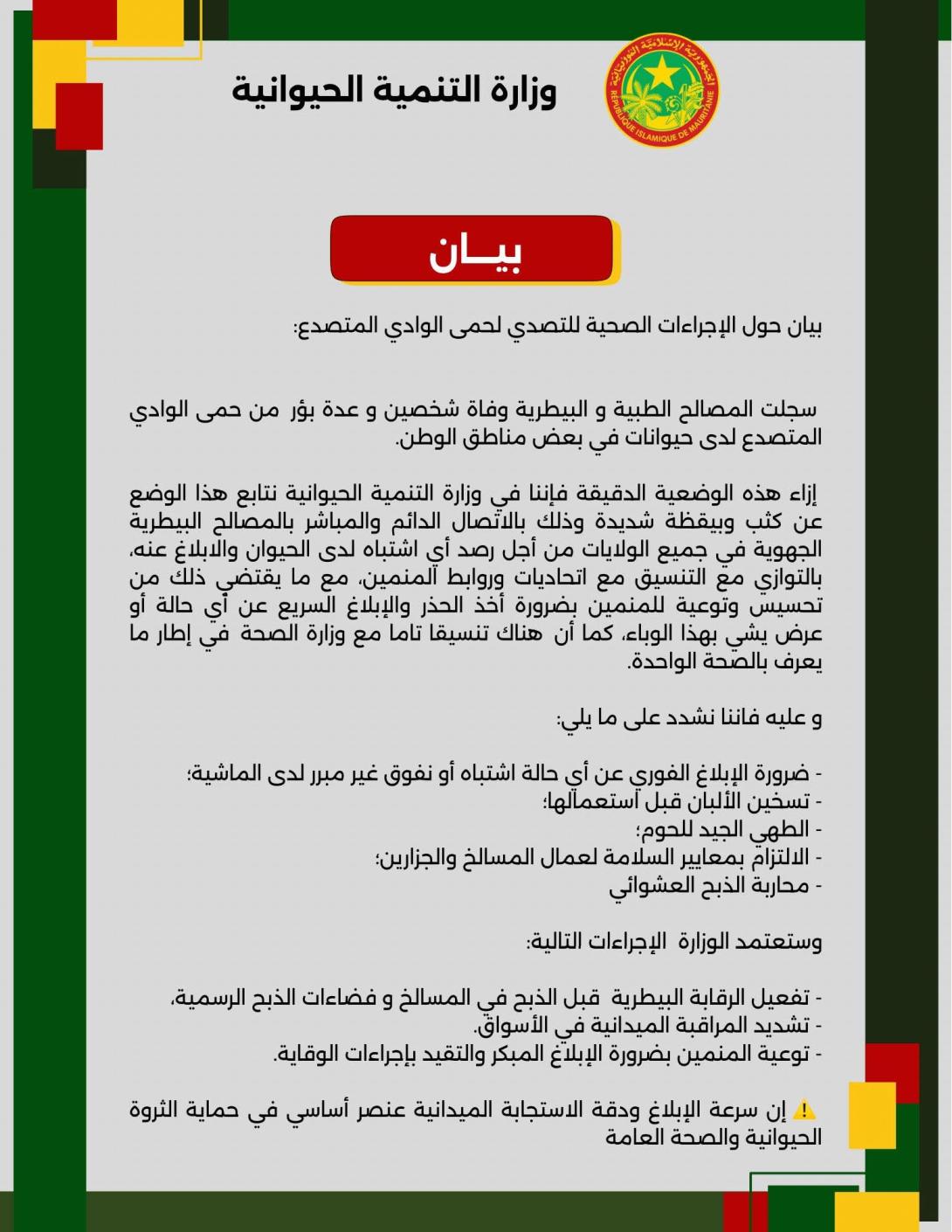 وأوضحت الوزارة في بيانها أن المصالح الطبية والبيطرية سجلت وفاة شخصين و عدة بؤر من حمى الوادي المتصدع لدى حيوانات في بعض مناطق الوطن.