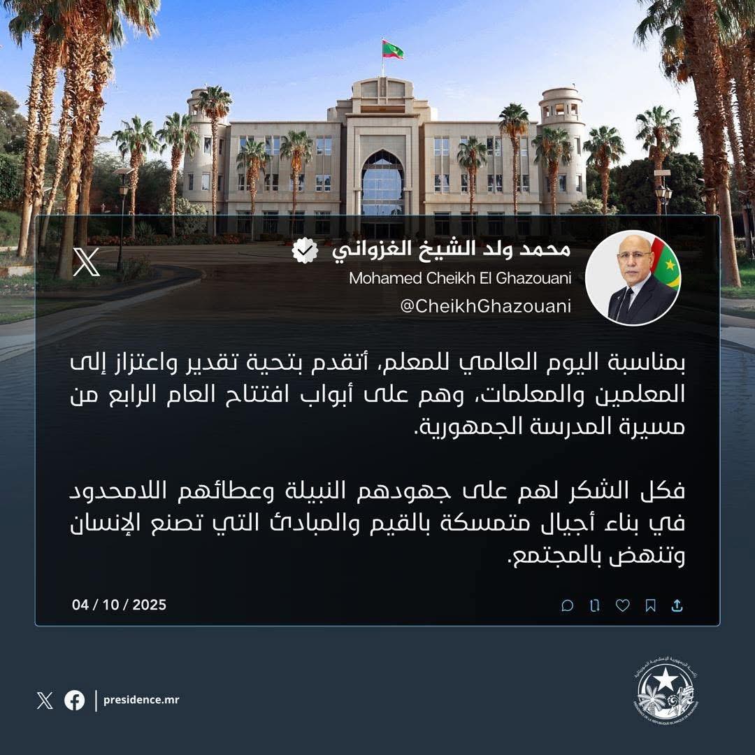 هنأ الرئيس الموريتاني محمد ولد الشيخ الغزواني، المعلمين الموريتانيين بمناسبة اليوم العالمي للمعلم