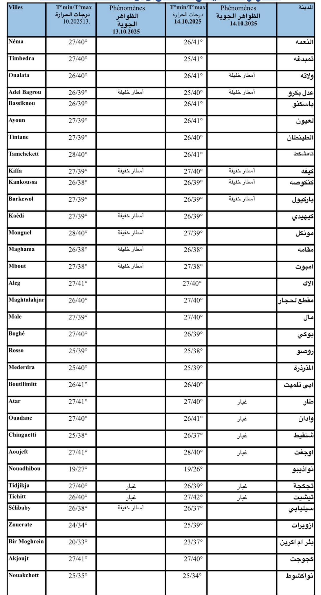 توقعت الهيئة الوطنية للأرصاد الجوية تساقطات مطرية خفيفة على أقصى جنوب كيدي ماغا وكوركل ولعصابة والحوضين.
