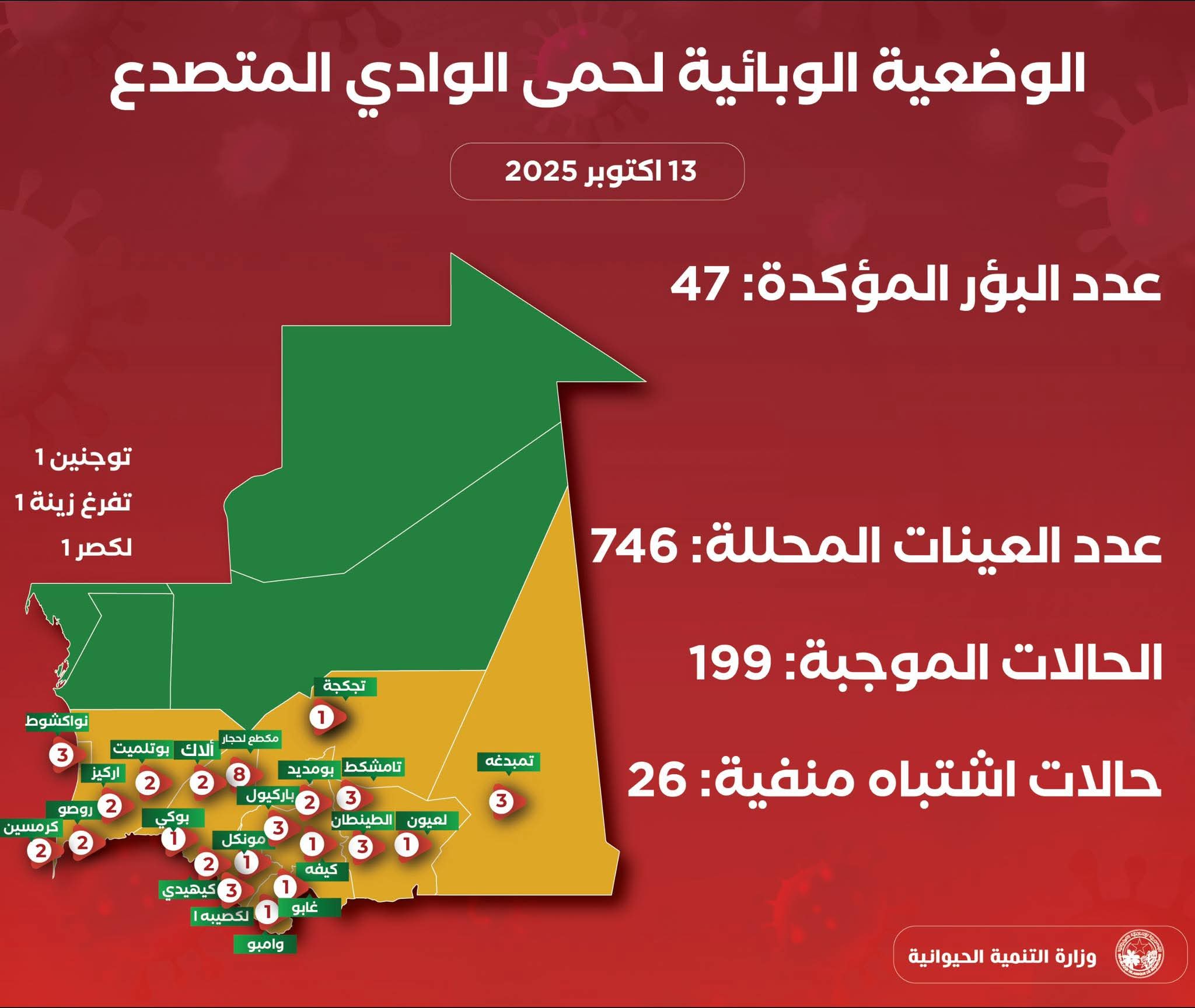 أعلنت وزارة التنمية الحيوانية ارتفاع عدد البؤر الحاضنة لحمى الوادي المتصدع بموريتانيا إلى 47 بؤرة موزعة على23 مقاطعة تتبع ل10 ولايات