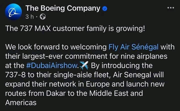 أعلنت شركة بوينغ عن توقيع اتفاق مع الخطوط الجوية السنغالية لاقتناء تسع طائرات من طراز 737 ماكس، وذلك على هامش مشاركتها في معرض دبي للطيران، في ما وصفته الشركة بأنه "أكبر التزام للطيران السنغالي حتى الآن".