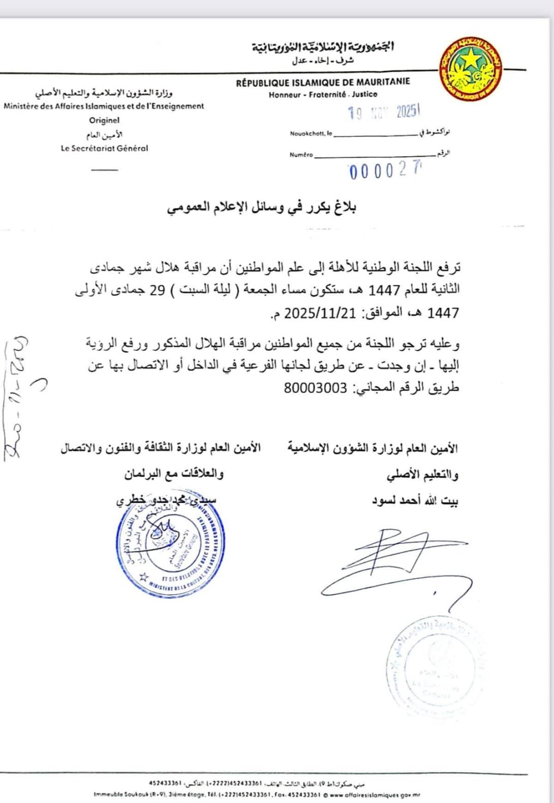 دعت اللجنة المركزية لمراقبة الأهلة المواطنين على كافة التراب الوطني إلى مراقبة شهر هلال جمادي الثانية للعام الهجري 1447.