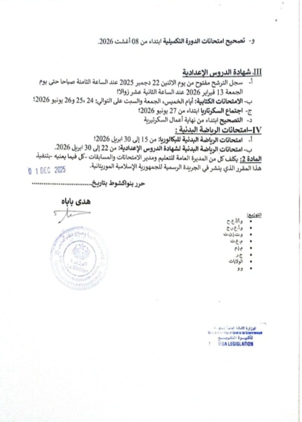 أعلنت وزارة التربية وإصلاح النظام التعليمي عن الأجندة الرسمية للامتحانات الوطنية للعام الدراسي 2025 – 2026، وذلك بموجب مقرر موقع من طرف الوزيرة هدى بنت باباه، حيث تم اعتماد الفترة الممتدة من 22 يونيو إلى 2 يوليو 2026 لإجراء مختلف الامتحانات.