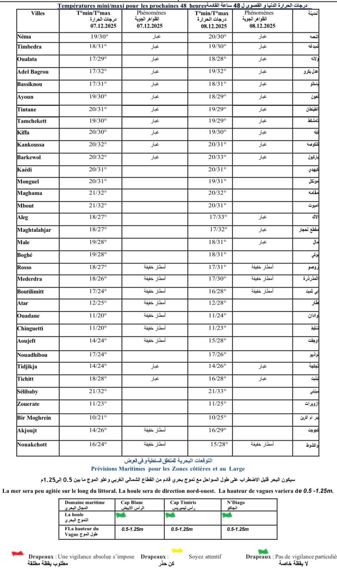 وأكدت أنه بالنسبة لنواكشوط فستكون الرياح ضعيفة إلى معتدلة شرقية إلى شمالية شرقية بينما ستكون السماء غائمة، مصحوبة بتساقطات مطرية خفيفة.