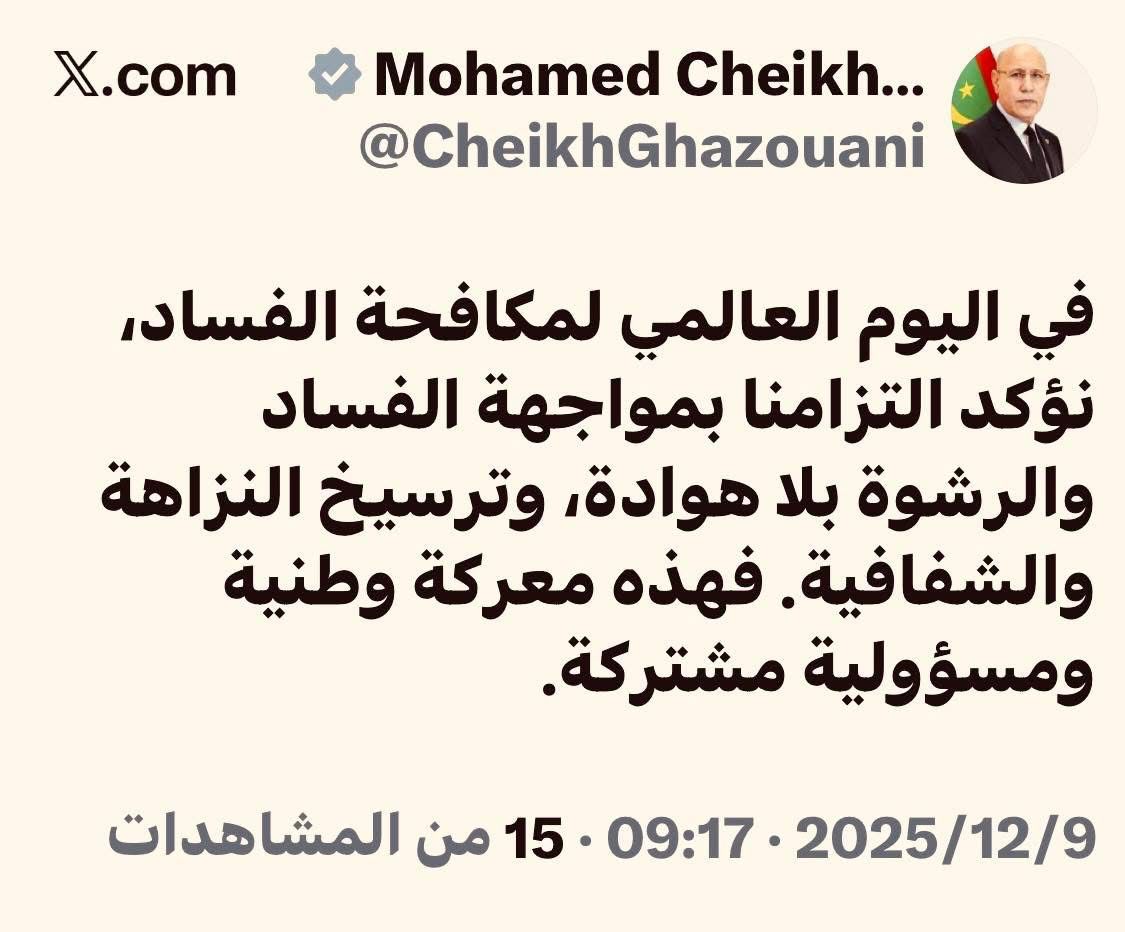 جاء ذلك في تغريدة للغزواني على منصة X بمناسبة اليوم العالمي لمكافحة الفساد.