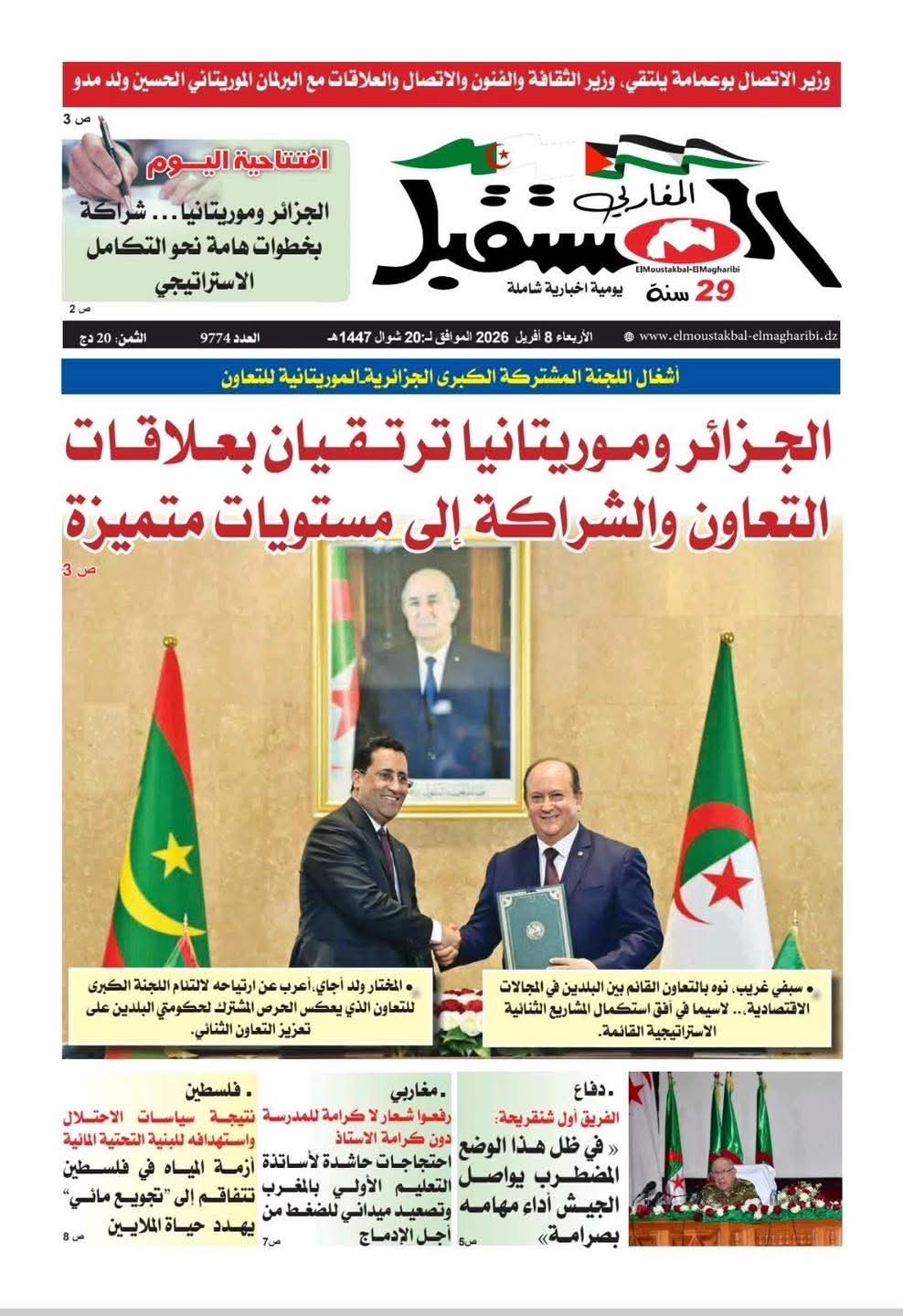 •    جريدة المستقبل: الجزائر وموريتانيا ترتقيان بعلاقات التعاون والشراكة إلى مستويات متميزة