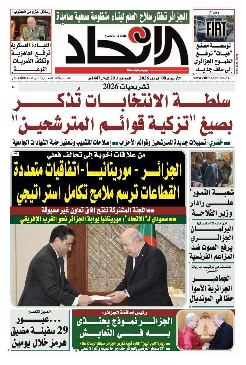 •    جريدة الاتحاد: الجزائر - موريتانيا .. اتفاقيات متعددة القطاعات ترسم ملامح تكامل استراتيجي