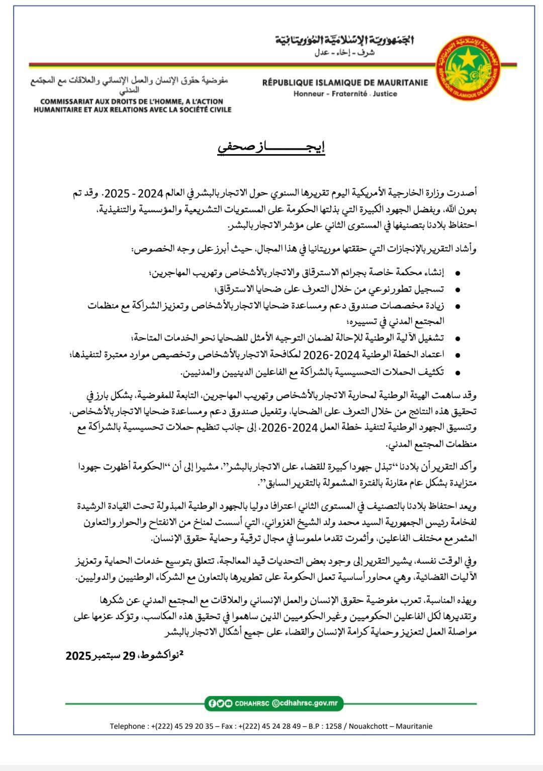 ويعد احتفاظ بلادنا بالتصنيف في المستوى الثاني اعترافا دوليا بالجهود الوطنية المبذولة تحت القيادة الرشيدة لفخامة رئيس الجمهورية السيد محمد ولد الشيخ الغزواني، التي أسست لمناخ من الانفتاح والحوار والتعاون المثمر مع مختلف الفاعلين، وأثمرت تقدما ملموسا في مجال ترقية وحماية حقوق الإنسان.