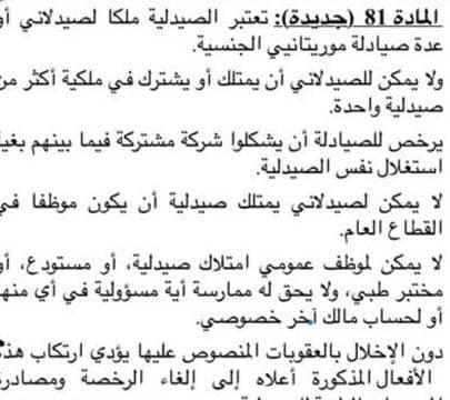 عبّر السلك الوطني للصيادلة الموريتانيين عن قلقه العميق من المادة (81) الواردة في مشروع قانون الصيدلة المعروض قريبًا على البرلمان، معتبرًا أنها تمثل "خطرًا جسيمًا على المهنة والمصلحة الوطنية"، داعيًا السلطات التشريعية والتنفيذية إلى إلغائها أو تعديلها بشكل جذري.
