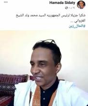 الإعلام نت - تناقلت صفحات على موقع التواصل الإجتماعي فيسبوك خبرا يفيد منح رئيس الجمهورية الجمهورية محمد ولد الشيخ الغزواني مبلغ 10 ملايين أوقية للممثل حمادة سيداتي.