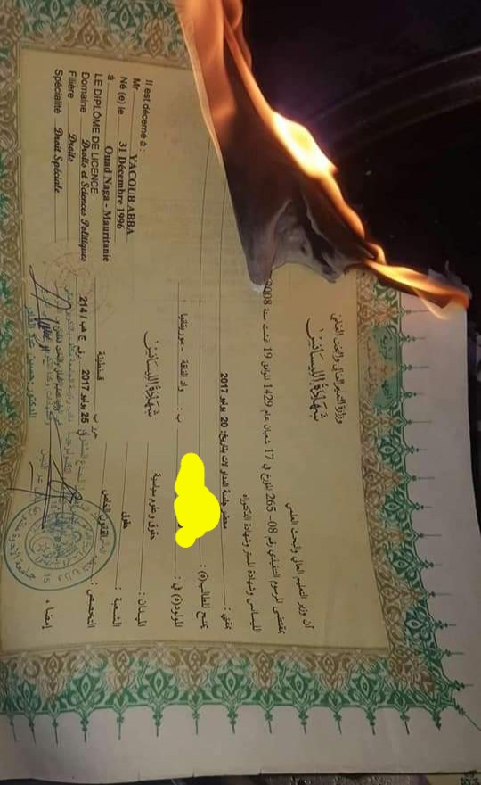 وتظهر الصور شهادتين إحداهما شهادة باكلوريا والأخرى شهادة ليسانص من جامعة انواكشوط، وبحسب المدونين فإن الشاب سئم البحث عن العمل، وحين يئس منه أقدم على حرق شهاداته كاحتجاج على انتشار البطالة، وعجز الدولة عن احتواء الشباب العاطلين.