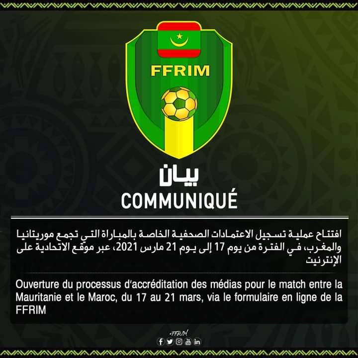 يسر الاتحادية الموريتانية لكرة القدم أن تبلغ كافة الإعلاميين والصحافيين بفتح باب استقبال طلبات الاعتماد لتغطية مباراة المنتخب الوطني مع نظيره المغربي، في ملعب شيخا بيديا بنواكشوط، يوم 26 مارس 2021، لحساب الجولة الخامسة من التصفيات المؤهلة لكأس أفريقيا للأمم 2021.
