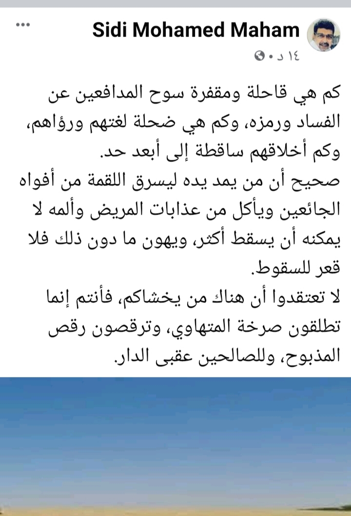 الإعلام نت _ كتب الوزير السابق سدي محمد ولد محم، تدوينة على الفيس بوك، واصفا فيها حال المدافعين عن المفسدين.