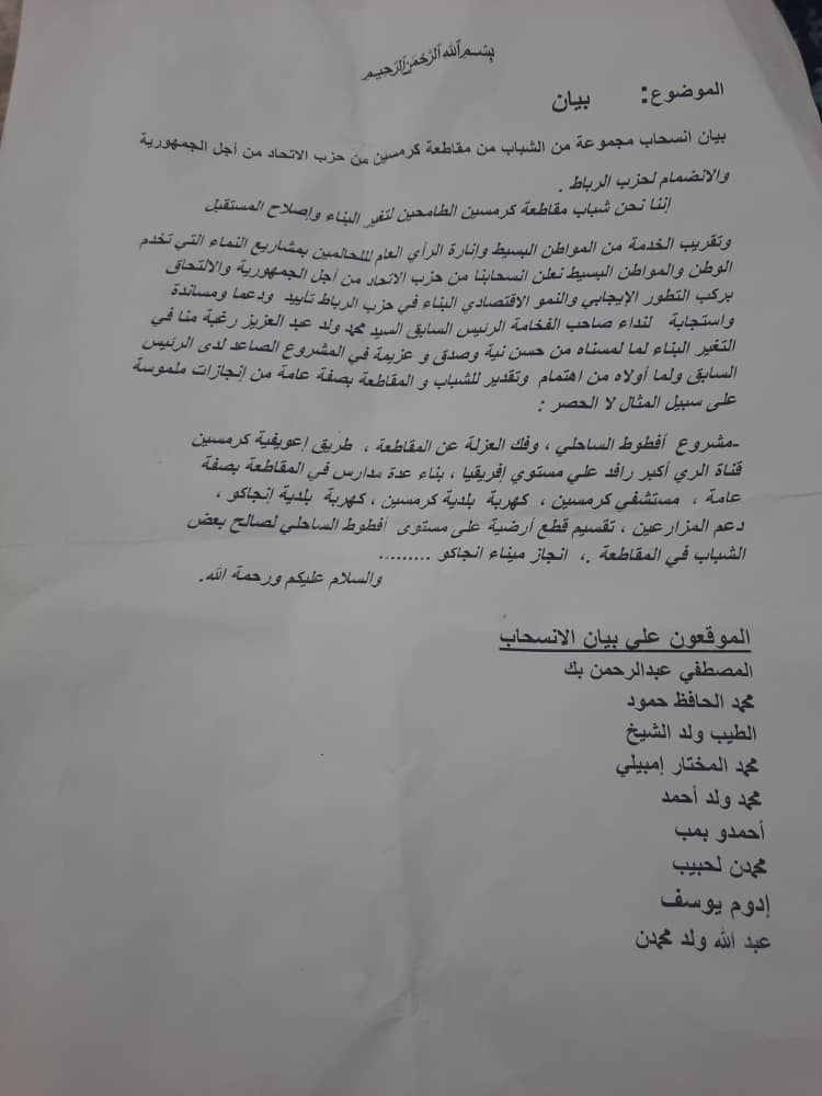 الإعلام نت _ أصدر مجموعة من شباب مقاطعة كر مسين التابعة لولاية اترارزة بيان أعلنوا خلاله انسحابهم من حزب الإتحاد من أجل الجمهورية، وانتسابهم لحزب الرباط.