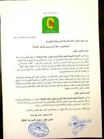 الإعلام نت - طالبت الحملة الشعبية للتمكين للغة العربية وتطوير لغاتنا الوطنية في رسالة موقعة من طرف أمينها العام محمد الأمين ولد الفاضل، إلى مديري شركتي الكهرباء والماء بتعريب الفواتير.