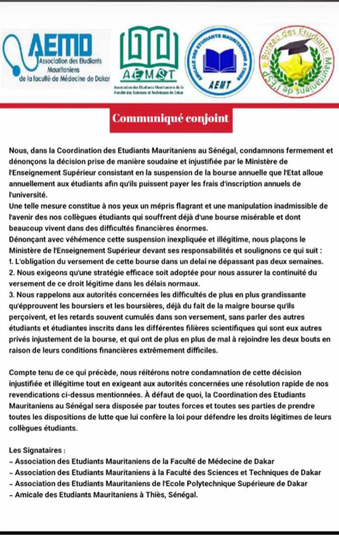 إننا في منسقية الطلاب الموريتانين في السنغال نستنكر بشدة وندد بما قامت به وزارة التغليم العالي والبحث العلمي من قطعها غير المبرر لمنحة رسوم التسجيل والتي دأبت الدولة سنويا على صرفها لصالح الطلاب كي يتسني لهم دفع تكاليف التسجيل السنوي للجامعة