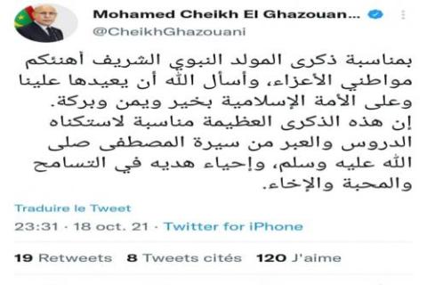 الإعلام نت : هنأ الرئيس غزواني الشعب الموريتاني بمناسبة ذكرى المولد النبوي الشريف، جاء ذلك خلال تغريدة له على تويتر، موضحا ان ذكرى المولد النبوي الشريف مناسبة عظيمة "لاستكناه العبر الدروس والعبر من سيرة المصطفى صلى الله عليه وسلم ، وإحياء هديه في التسامح والمحبة والإخاء"