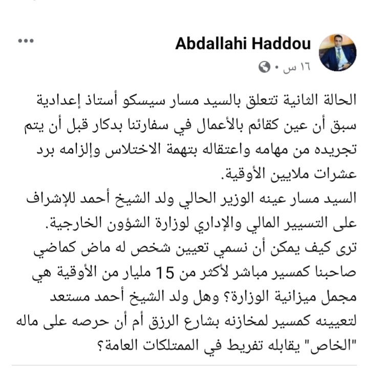 وقال :" ترى كيف نسمي تعيين شخص له ماض كماضي صاحبنا كمسير مباشر لأكثر من 15 مليار أوقية هي مجمل ميزانية وزارة الخارجية".