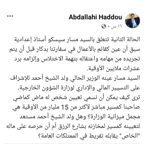 وأضاف ولد محمد حدو في تدوينة له عبر حسابه على فيسبوك، أن سيسكو عينه وزير الخارجية الحالي إسماعيل ولد الشيخ أحمد مديرا إداريا وماليا بالوزارة.