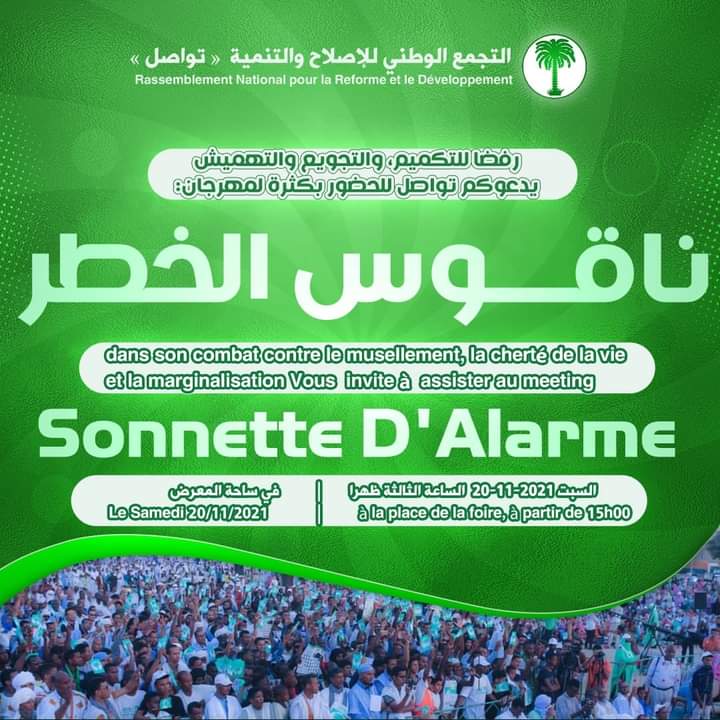 الإعلاك_نت : أعلن حزب التجمع الوطني للإصلاح والتنمية تواصل عن نيته تنظيم مهرجان بوم السبت المقبل بساحة المعرض تحت عنوان "ناقوس الخطر"