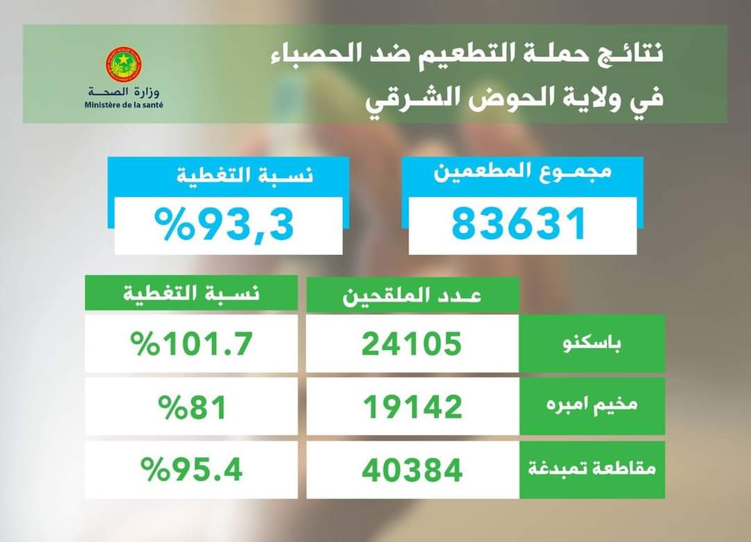 (الإعلام نت) كشفت وزارة الصحة الموريتانية اليوم عن حصيلة الملقحين ضد داء الحصباء خلال حملة التلقيح الأخيرة في الشرق الموريتاني.