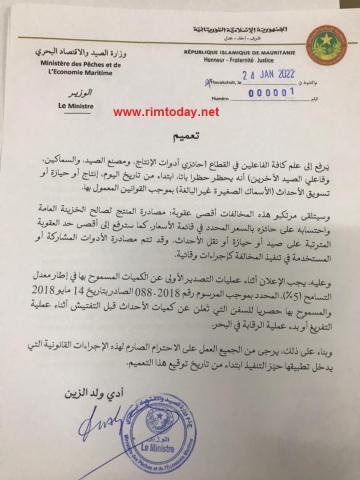 كما حدد التعميم الكمية المسموح بها للسفن التى تعلن عن كميات الأسماك الصغيرة المصطادة قبل التفتيش أثناء عملية التفريغ ،او بدء عملية الرقابة في البحر وهي نسبة خمسة في المئة المحددة بموجب المرسوم رقم088 بتاريخ 2018.
