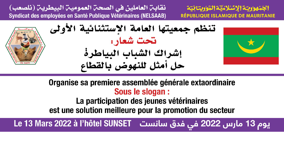 (الإعلام نت): أطلقت نقاية العاملين في الصحة العمومية البيطرية صباح اليوم الأحد بنواكشوط أعمال جمعيتها العامة الاستثنائية الأولى تحت شعار "إشراك الشباب البياطرة حل أمثل للنهوض بالقطاع"