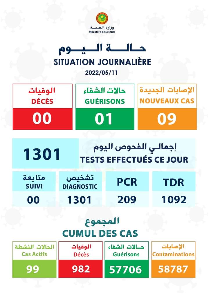 وقالت الوزارة في نشرتها اليومية إنها توصلت للنتيجة بعد إجراء 1301 فحصا منها TDR: 1092 و PCR: 209 و 1301 حالة تشخيص