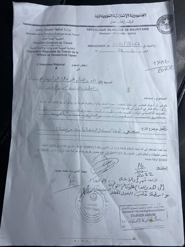 وحسب وثيقة نسبت للمفتشية فإن المدير العام لوكالة الإحصاء مطلوب للحضور يوم غد 24-05-2022 عند الساعة 12:00 " تحت طائلة الغرامة المالية حال الغياب بمبلغ يتراوح بين 30 إلى 60 ألف أوقية جديدة"