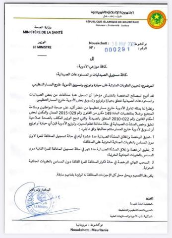 وجاء في تعميم وقعه الوزير المختار ولد داهي اليوم أنه سيتم تعليق الرخصة وإغلاق المنشأة الصيدلية مدة عشرة أيام في حالة تسجيل المخالفة للمرة الأولى دون المساس بالعقوبات الجنائية المترتبة على المخالفة.