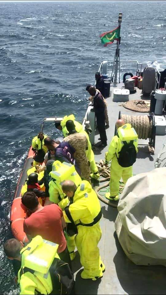 قامت بإنقاذ من غادروا السفينة المنكوبة سالمين وهم 32 بحارا من بينهم 8 موريتانيين. و بعد ساعات طويلة من التدخل تم تطويق النيران والسيطرة عليها. وقد طلبت السفينة الإذن بالسماح لها بالاتجاه الى ميناء نواكشوط او نواذيبو، إلا أن البحرية الوطنية رفضت السماح للسفينة المذكورة بالاتجاه الى أي من الميناءين او الاقتراب من مياهنا الإقليمية حفاظا على سلامة الملاحة وضمان عدم تلوث بيئتنا البحرية والشاطئية جراء أي تسرب لكمية الوقود الكبيرة التي تحملها. ومع نهاية مهمة الإنقاذ التي دامت حوالي 20 ساعة وإخماد الحريق دون أي اضرار بشرية، والتأكد من جاهزية السفينة وقدرتها على الإبحار تم السماح لها بالمغادرة باتجاه لاس بالماس للخضوع لأعمال الصيانة والإصلاح، كما تم وضع البحارة ال 32 على متن سفينة صيد أخرى تابعة لنفس الشركة لتتجه بهم نحو ميناء نواكشوط.