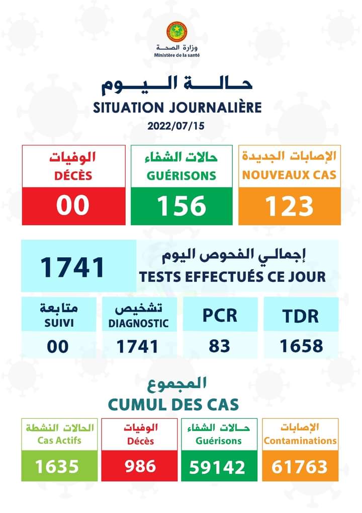 وقالت الوزارة في نشرتها اليومية إنها توصلت للنتيجة بعد إجراء 1741 فحصا منها TDR: 1658 و PCR: 83 و1741 حالة تشخيص