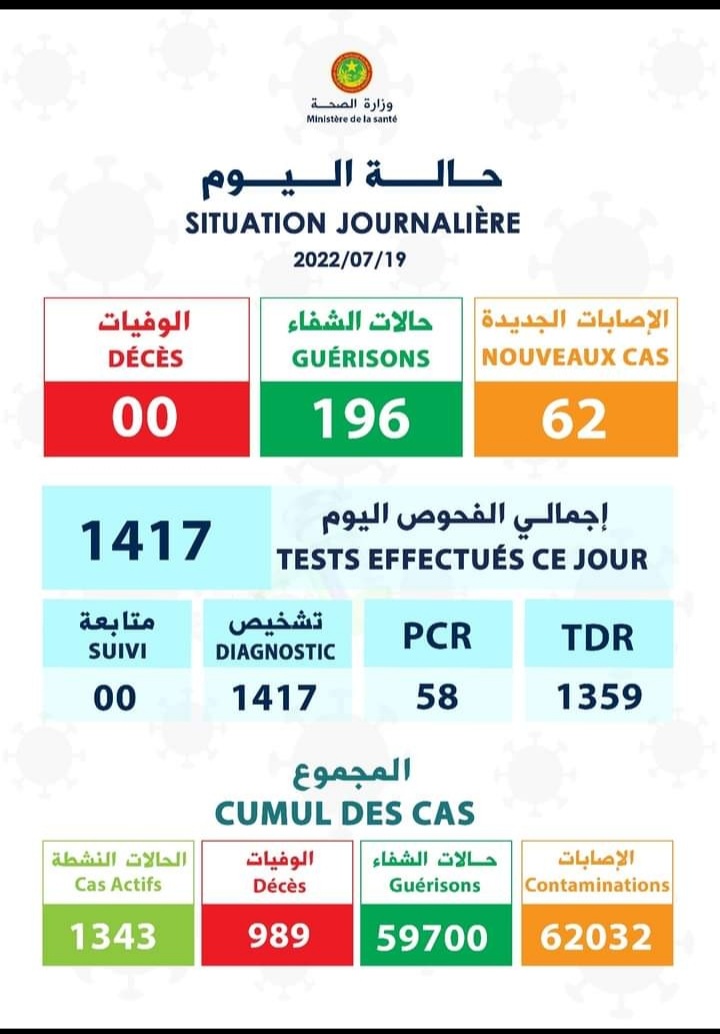 وقالت الوزارة في نشرتها اليومية إنها توصلت للنتيجة بعد إجراء 1417 فحصا منها TDR: 1359 و PCR: 58 و 141 حالة تشخيص