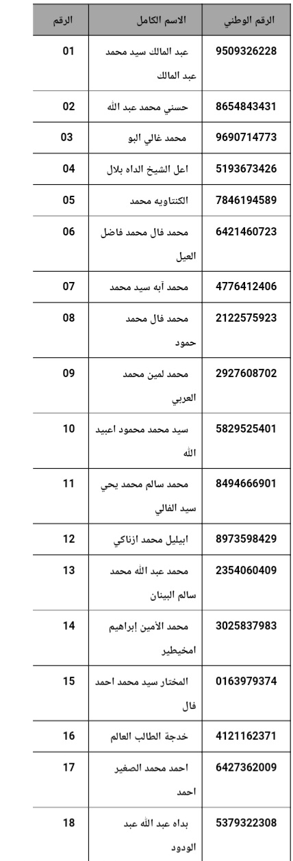 (الإعلام نت): "تطلب الأركان العامة للجيوش/المكتب الثالث من الشباب الموريتانيين، المبينة أسماؤهم وأرقامهم الوطنية في اللائحة التالية أنهم مدعوون للحضور يوم الخميس الموافق 15/09/2022 بمجمع بولتكنيك للمشاركة في مسابقة اكتتاب طالب ضابط مهندس متخصص في الأجهزة الطبية مصحوبين ببطاقات تعريفهم الوطنية"