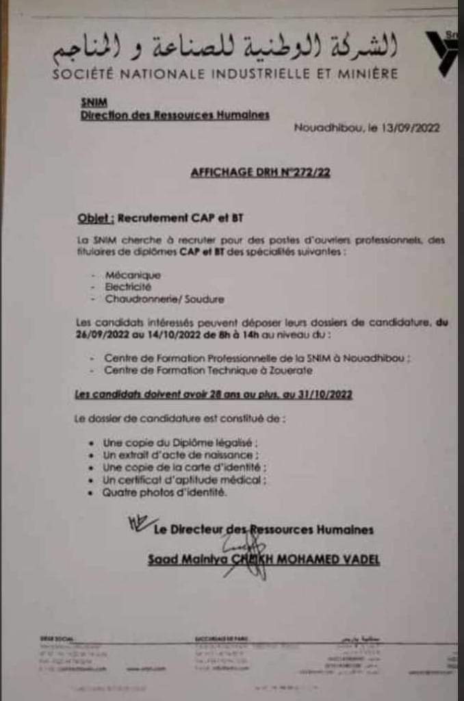 وأكدت الإدارة أنه على الراغبيين في المشاركة في الإكتتاب إيداع ملفاتهم ابتداء من 26/09/2022 حتى 14/10/2022 عند مركز التكوين الخاص بالشركة ازويرات انواذيبو.