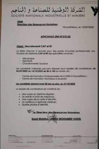 الإعلام نت - أعلنت إدارة المصادر البشرية بالشركة الوطنية للصناعة والمناجم "اسنيم" عن رغبتها في عمال يدويين فنيين من أصحاب شهادات CAP و BT.