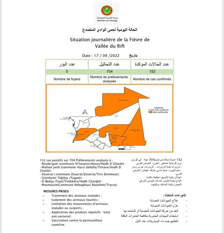 وقالت الوزارة في بيان لها إن عدد التحاليل التي أجريت وصلت 704 عينة في كل من الزويرات بتيرس الزمور وبودركل ومحم جيرب الحوض الغربي والنيملان في تكانت والبدعة بالحوض الشرقي والميمون بالترارزة.