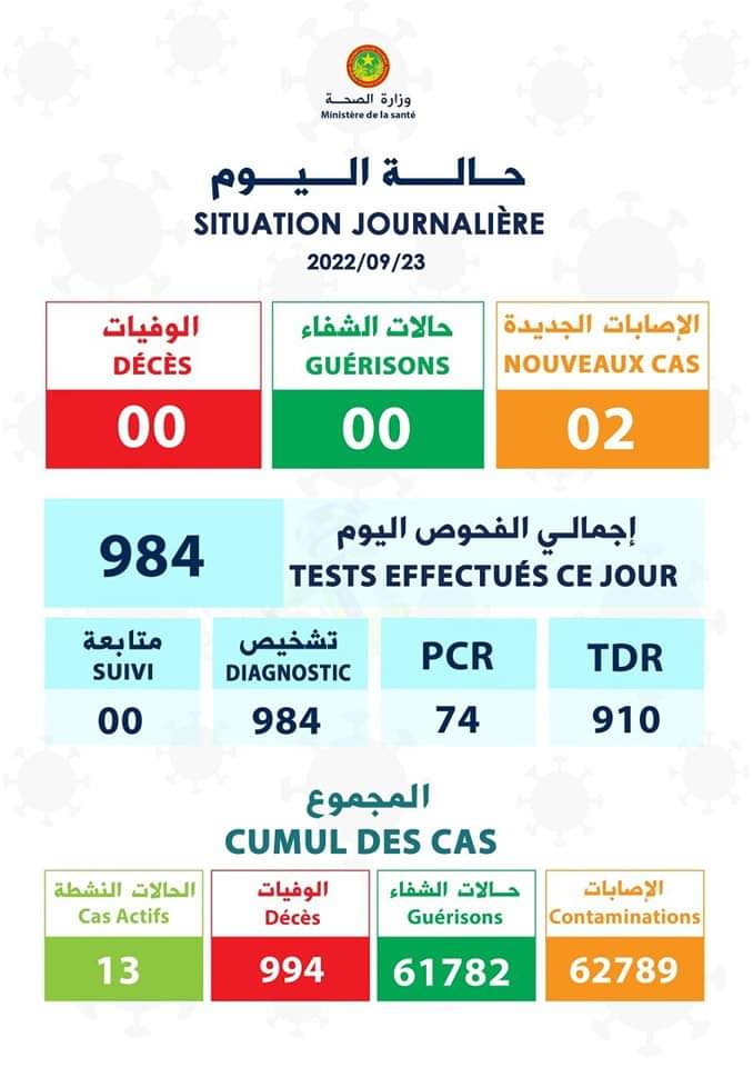 (الإعلام نت): أعلنت وزارة الصحة تسجيل 02 جديدة بفيروس كورونا دون تسجيل أي حالة شفاءء ولا حالة وفاة مرتبطة بالفيروس خلال 24 ساعة الماضية. وقالت الوزارة في نشرتها اليومية إنها توصلت للنتيجة بعد إجراء 984 فحصا منها TDR: 910 و PCR: 74 و984 حالة تشخيص