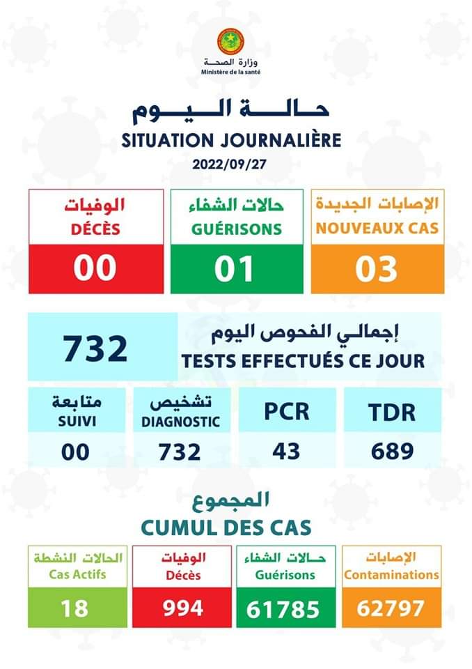 حالة اليوم الإصابات الجديدة: 03 حالات الشفاء: 01 حالات الوفاة: 00 ----- مجموع الفحوص اليوم: 732 TDR: 689 PCR: 43 التشخيص: 732 المتابعة: 00