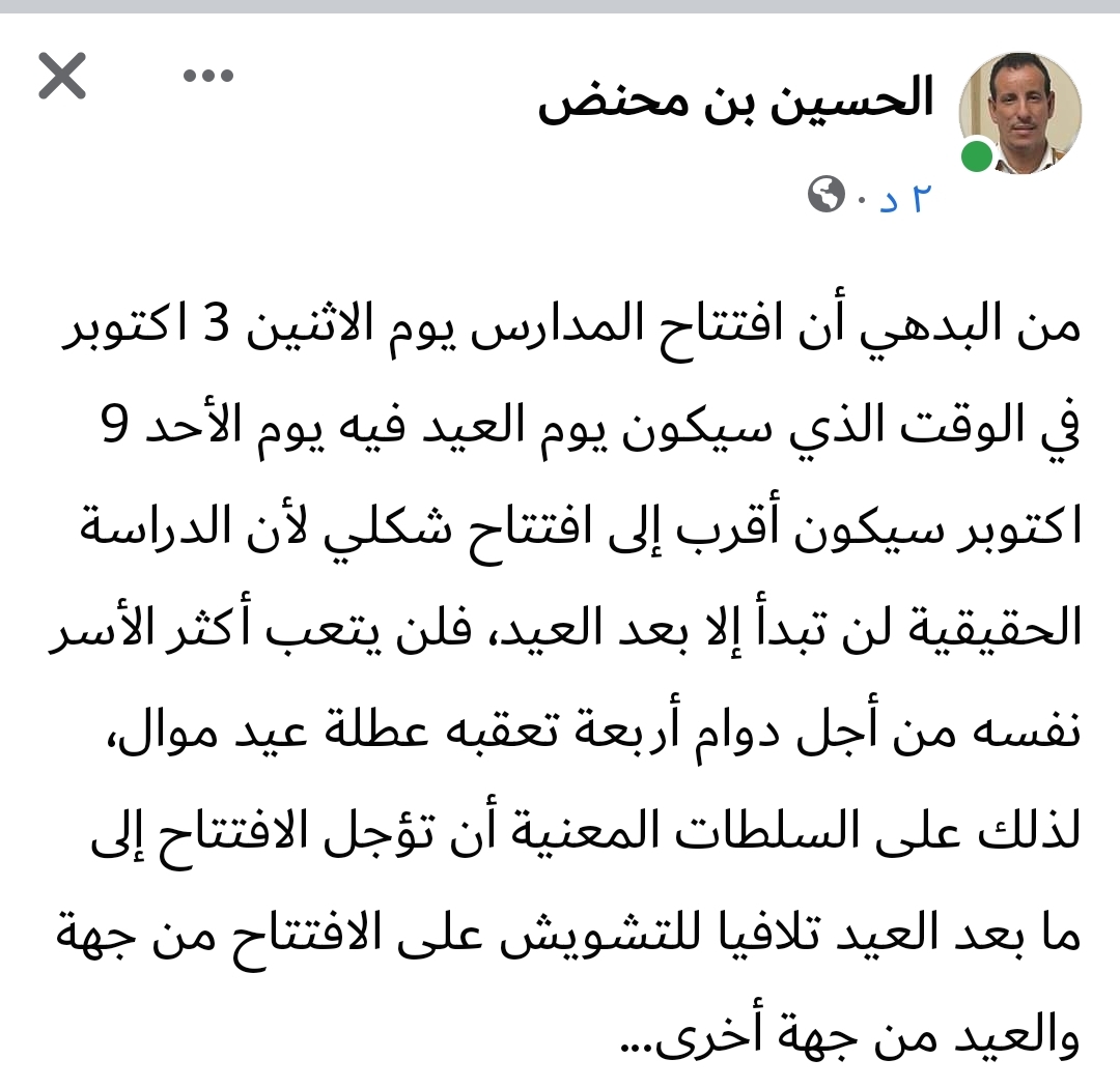 وأضاف ولد محنض أنه من البديهي أن افتتاح المدارس يوم الإثنين 3 أكتوبر في الوقت الذي سيكون العيد يوم الأحد 9 أكتوبر سيكون أقرب لافتتاح شكلي.