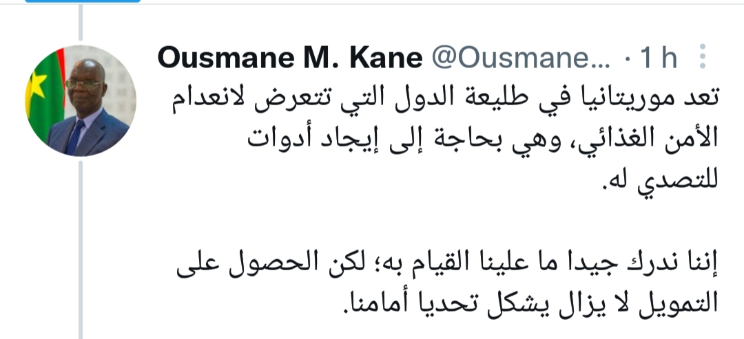 (الإعلام نت): قال وزير الشؤون الاقتصادية وترقية القطاعات الإنتاجية عثمان مامادو كان إن موريتانيا "تعد في طليعة الدول التي تتعرض لانعدام الأمن الغذائي"