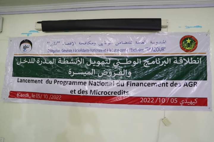(الإعلام نت): أطلقت المندوبية العامة للتضامن الوطني ومكافحة الإقصاء "التآزر" اليوم بمدينة كيهيدي "برنامجا وطنيا لتمويل الأنشطة المدرة للدخل و القروض الميسرة" بسقف مالي وصل 2 مليار و300 مليون أوقية.